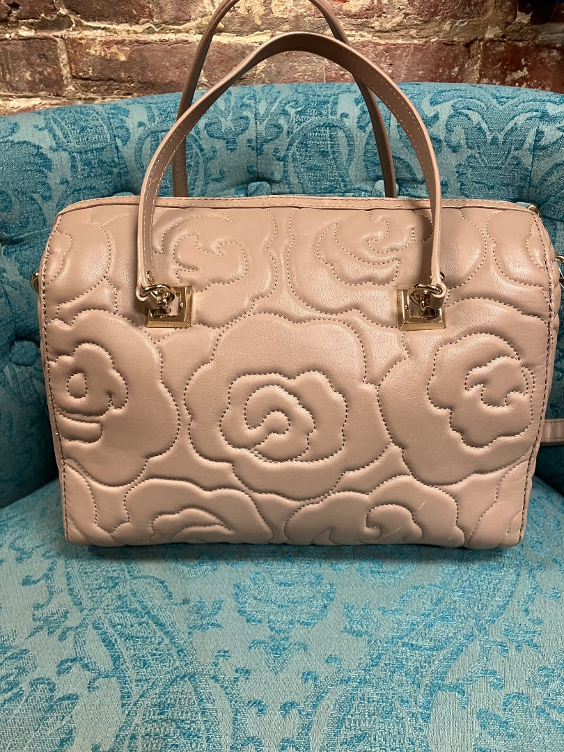 Quilted flower leather bag. 9inch tall, 11inch wide, 6inch depth, 13 inch strap drop. Great condition, light scratches, light pen stains inside.